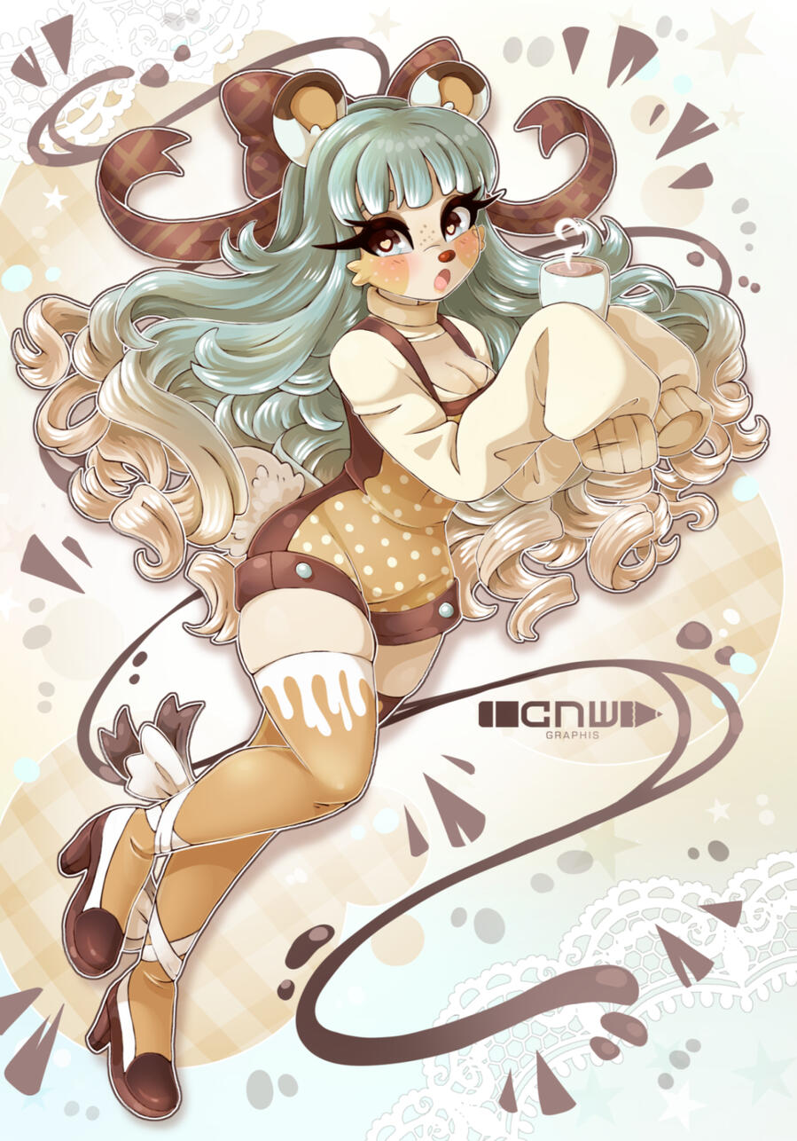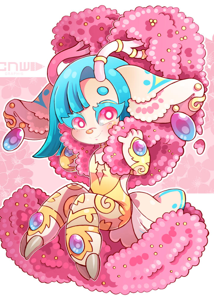 "Smol version of your character with a simple background. Details maybe simplified to fit the style.